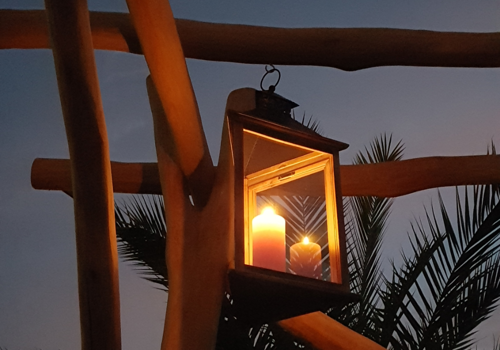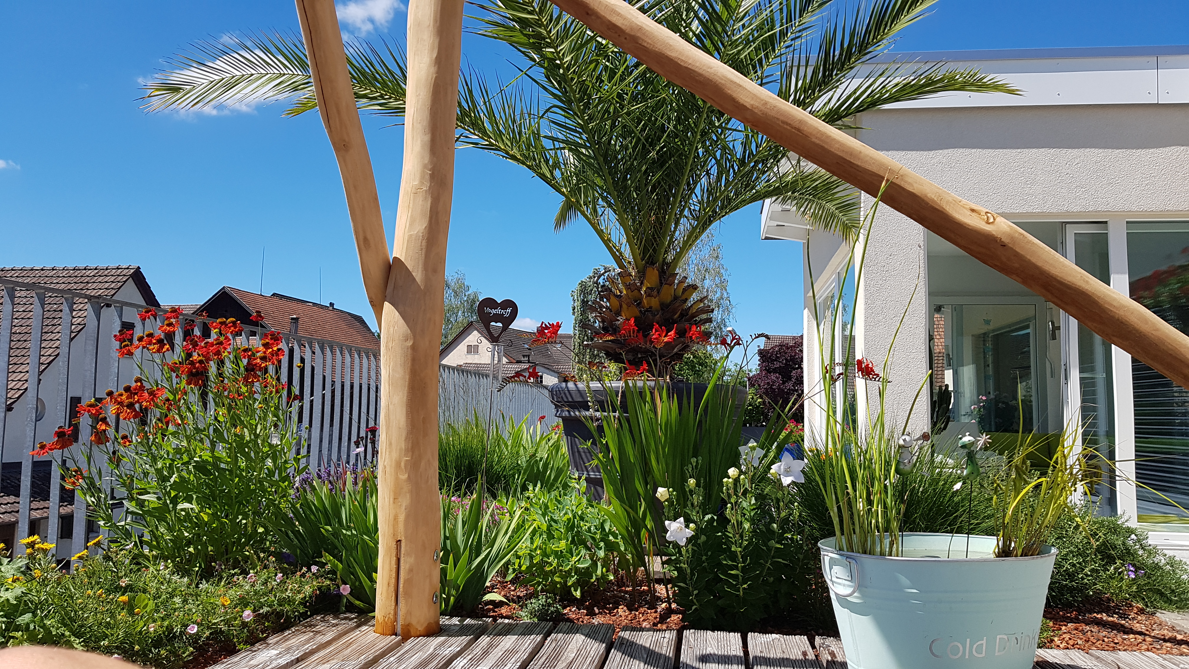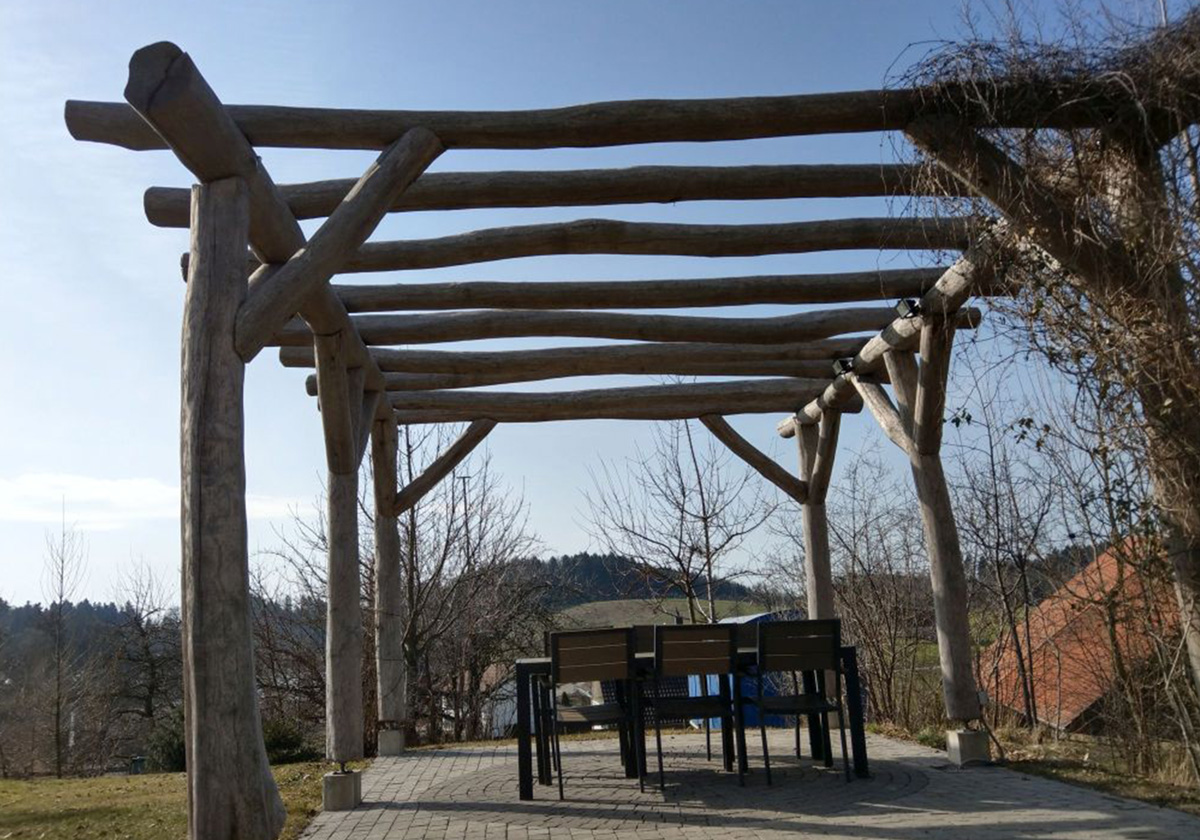 Die Pergola als Schattendach ist nach obenhin weitgehend offen und bietet Rankhilfe für Begrünung. Die natürlich gewachsenen Robinienstämme verleihen durch die unregelmässige Form ein einzigartiges Ambiente.